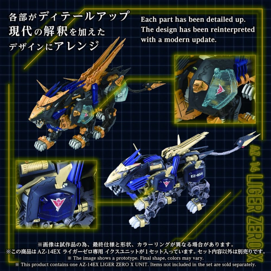 This product is a 1/72 scale assembly kit. This product contains only the unit (parts) required to recreate Liger Zero X when combined with an AZ series Liger Zero (base unit), such as the AZ-02EX2 Liger Zero Imperial Specification (sold separately) or the AZ-02 Liger Zero (sold separately). When equipped, various parts such as the shoulder covers, fins, drum capacitors, earth unit, and the back-mounted electro-driver are manually poseable. Includes a 1/72 scale unpainted pilot figure of a standard soldier, compatible with the cockpit of the Liger Zero (sold separately)."